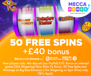 New Players only. Min deposit (Exc PayPal) £10. Bonus on selected games (30x Wagering) Max wins 5X bonus. 50 free spins and winnings on Big Bass Bonanza (10x Wagering on spins wins) only.